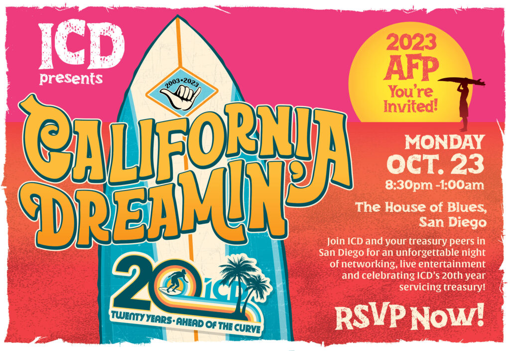 Be sure to sign up below for ICD’s 20th Anniversary party and celebrate with all of your treasury peers at the House of Blues. Visit us at booth 2016 to pick up your party credentials (required for entry). While you’re there, check out ICD’s new product offering, ICD Portfolio Analytics, which saves treasury pros countless hours piecing together disparate investment data to gain the full picture of their entire portfolio for analysis and reporting. See a demo of our newest solution and walk away with an ICD 20th Anniversary aloha shirt!