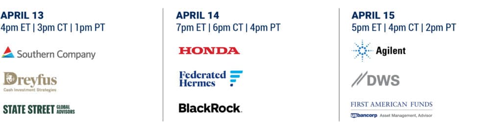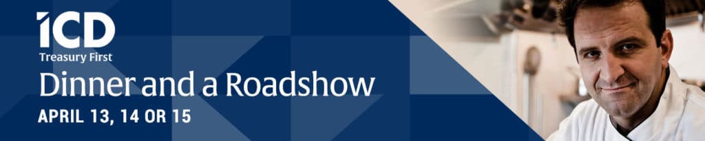 Each year ICD’s popular Roadshow stops in major cities across the U.S. and Europe, bringing treasury professionals, market experts and ICD staff together for an intimate, educational and fun networking event. While we can’t yet gather in person, ICD is bringing Dinner and a Roadshow to you this spring.