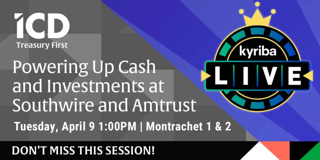Don’t miss our session to learn how the treasury teams at Amtrust and Southwire seized the opportunity to make the most of their cash and investments in 2023 by energizing their processes with a seamless workflow between Kyriba and ICD Portal. Integration enables both teams to operate with unparalleled visibility and control.